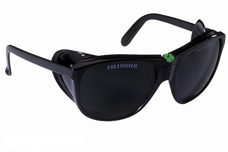 Lunettes à branches avec protection latérale. Verres interchangeables grâce à une vis centrale. Verres de rechange possible (vendus séparément). Branches fixes. Monture anatomique pour verres bombés. Matière : Monture et protection latérale en polyamide. Oculaires en verre minéral teinte 5. Poids : 20 gr (sans verre).